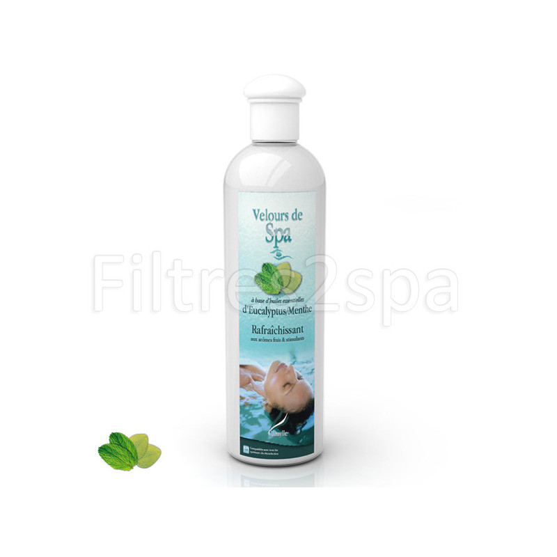 | Les bienfaits du velours de spa parfum Eucalyptus et MentheLe parfum pour spa Eucalyptus est composé d'huiles essentielles 100% pures et naturelles, rigoureusement sélectionnés selon un cahier des charges strict. |