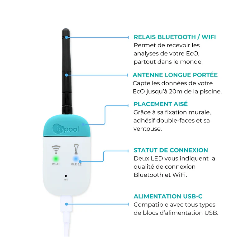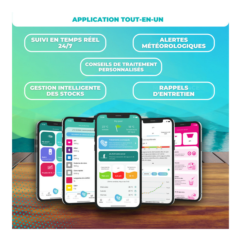 Cette sonde intelligente mesure en continu les 3 paramètres essentiels de votre eau : pH, ORP (capacité de désinfection) et température. Grâce à lui fini les bandelettes et les approximations : l'application mobile vous dit exactement quoi faire et quand le faire.