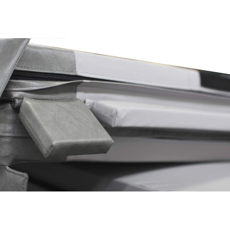 Les revêtements : Le couvercle est ainsi recouvert d'un vinyle de qualité marine sur lequel est appliqué une protection anti-UV ainsi qu'une protection antifongique contre les moisissures et autres champignons là où, pour la partie inférieure, il a été privilégié une doublure en vinyle laminé pour faire face aux remontées acides et nocives des produits chimiques par effets de vapeur.