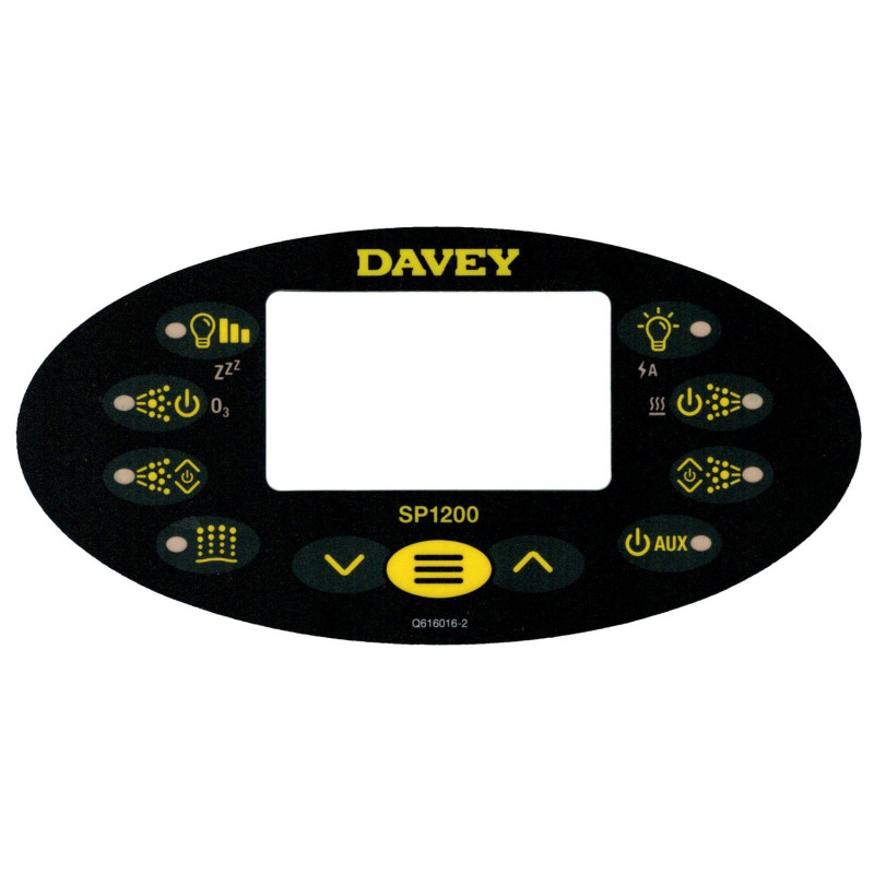 Ce revêtement adhésif de la marque australienne Davey Spa Power est compatible avec les claviers de commande ovales SP1200, utilisés avec les boîtiers de contrôle haut de gamme du fabricant. Ces systèmes sont couramment installés sur des spas de marques telles que RotoSpa, Sapphire Spas ou Monarch Spa.