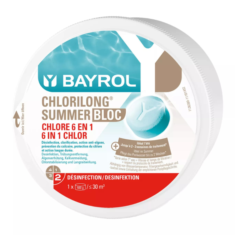 Chlorilong Summer Bloc 500 g s’utilise principalement dans le skimmer et convient à la plupart des piscines équipées d’une filtration classique, pour des bassins à partir d’environ 20 m³. Il est particulièrement adapté lorsqu’on recherche un traitement longue durée pendant une absence prolongée.